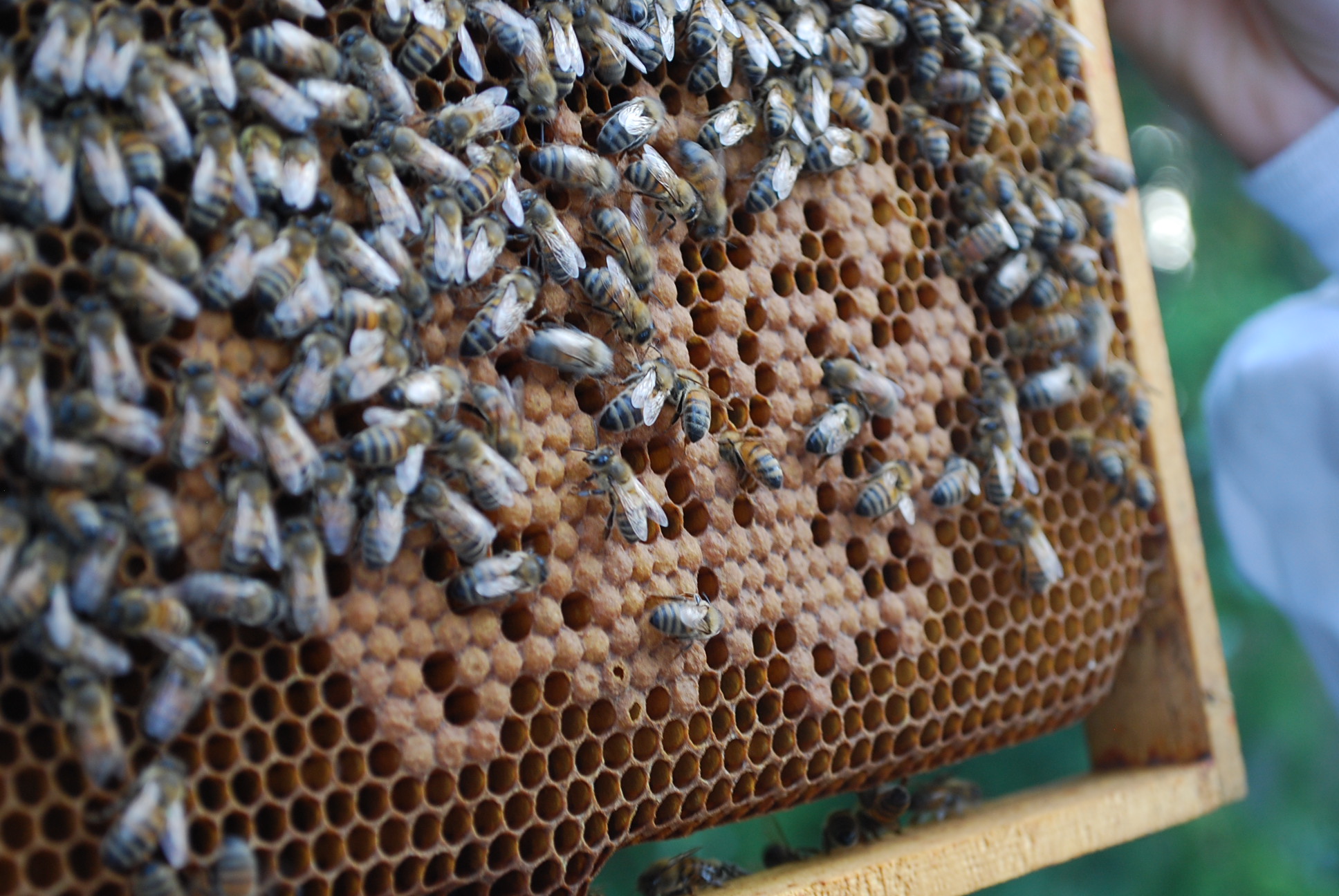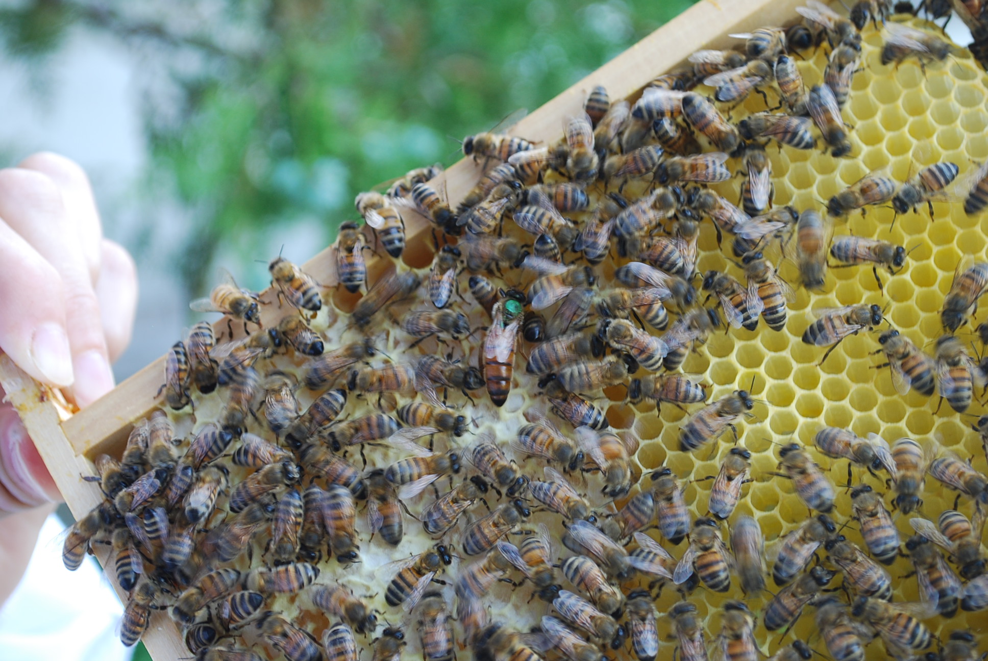 Trouvons la reine! Sur la photo ci-dessous, on peut la voir, elle a un point vert et son abdomen est plus gros que les autres (dû à sa « spermathèque »!). Le code couleur des reines change chaque année.