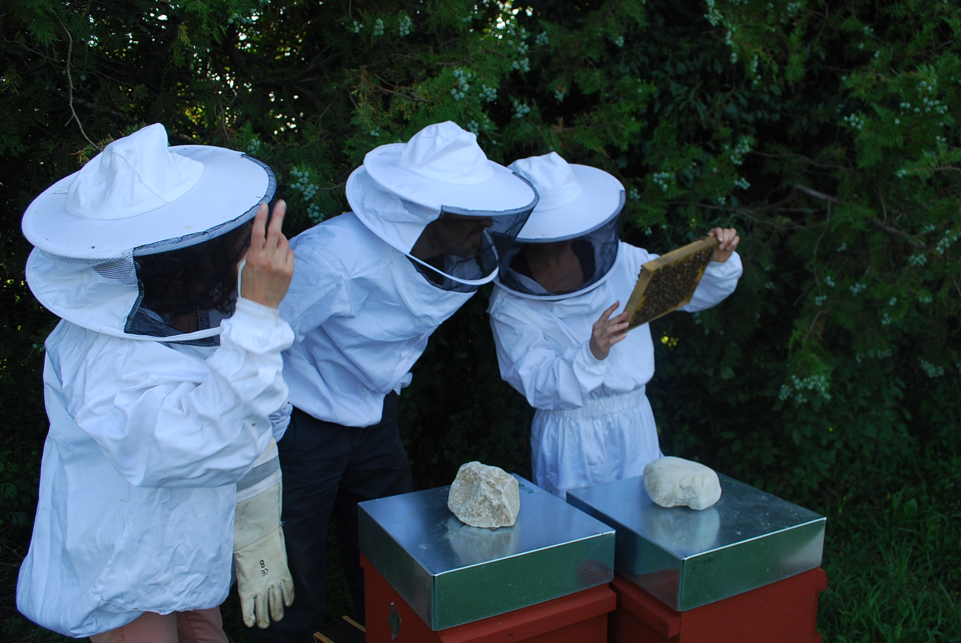 Ce soir visite du rucher en compagnie de mon père (en vacances pour la semaine chez moi) et de Julie & Thierry.