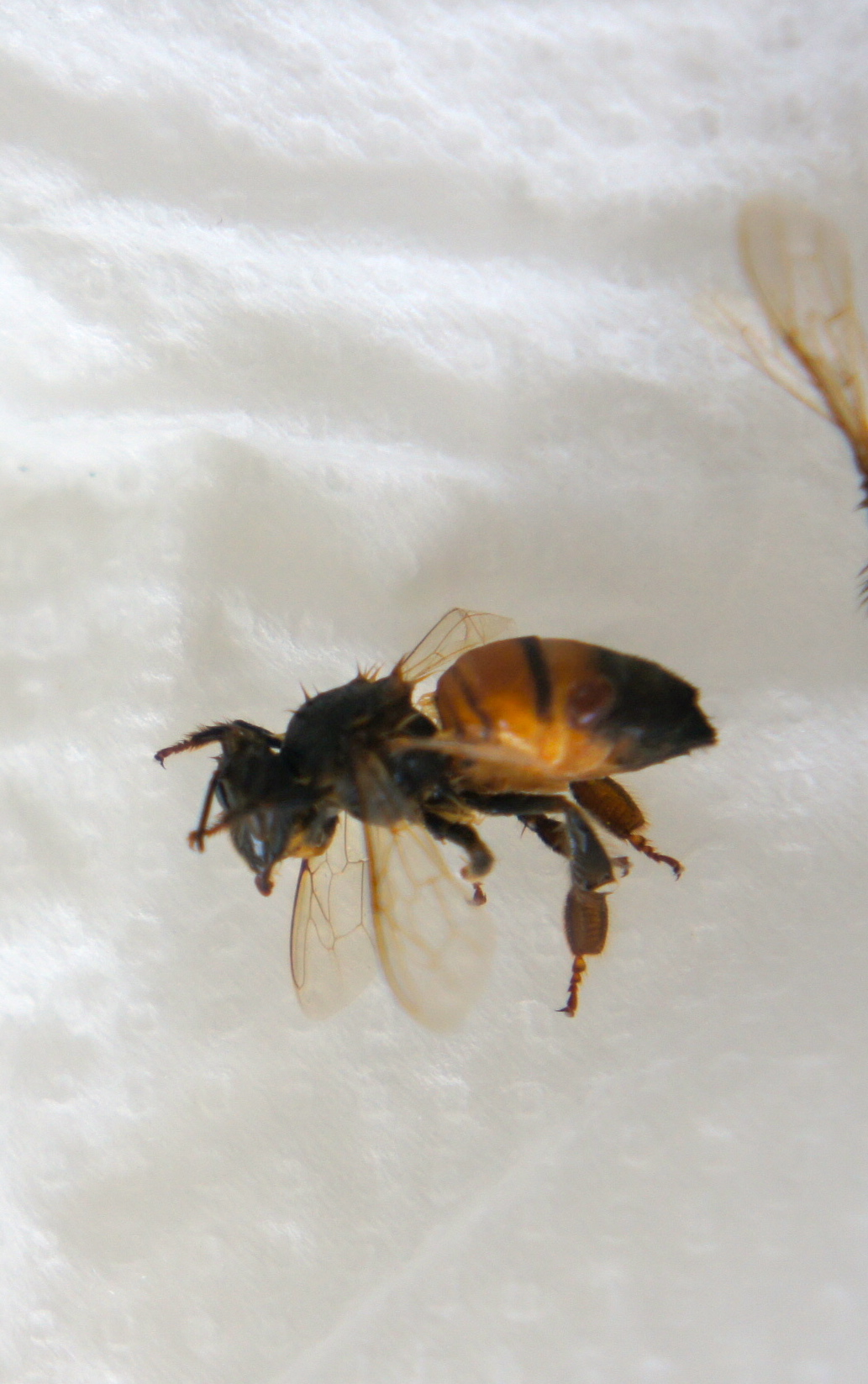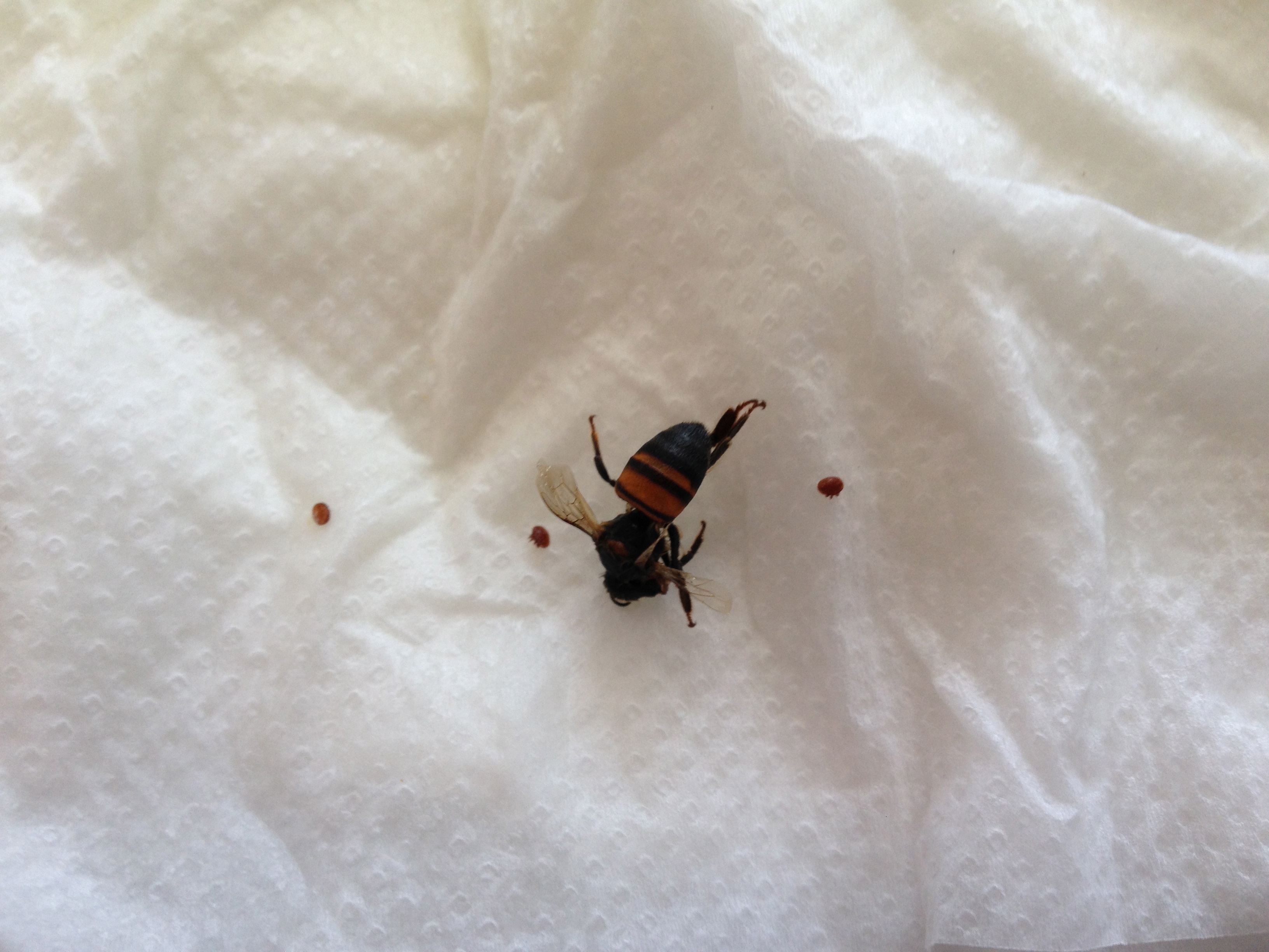 Sur la photo de gauche, on voit 3 varroas, et une abeille.