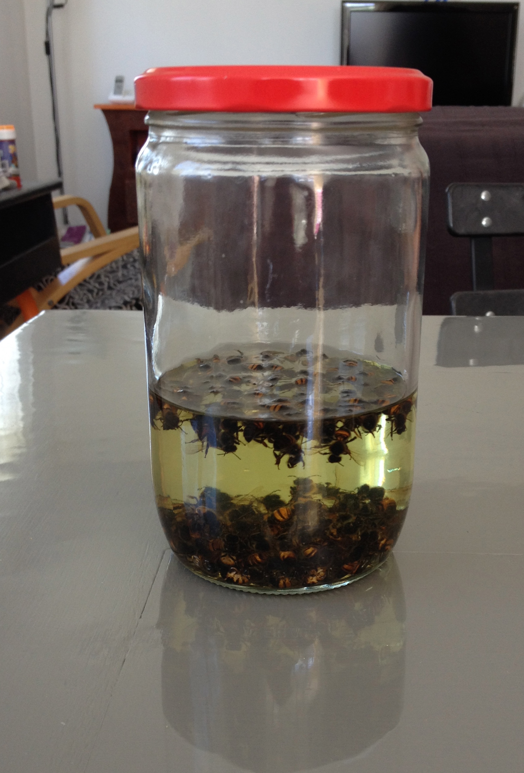 La méthode peut paraitre un peu cruelle, car il s’agit de récupérer une centaine d’abeilles et de les mettre dans un bocal rempli d’alcool. Elles sont immédiatement tuées. Les varroas se décollent des abeilles pour la plupart du temps. Si ils ne décollent pas, on tri les abeilles saines de celles atteintes. Puis on peut obtenir un % d’infestation de la colonie.