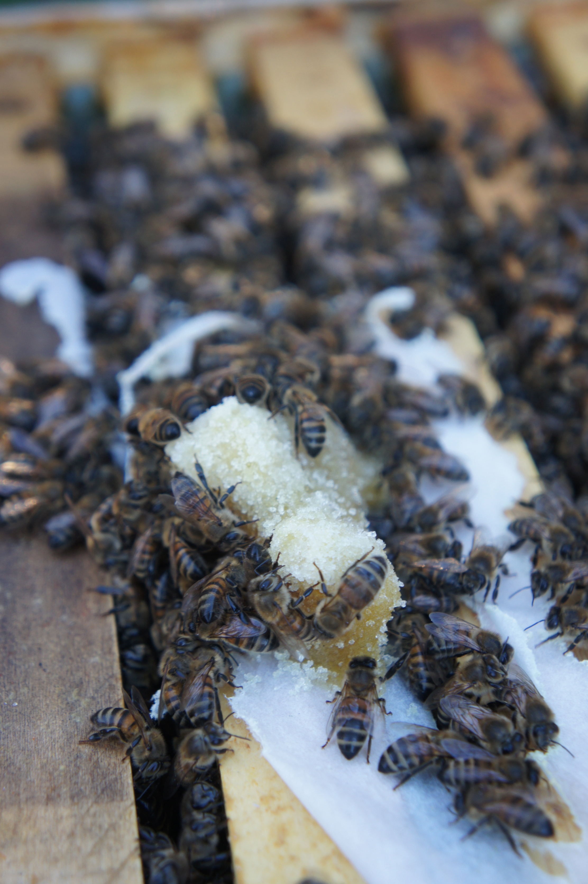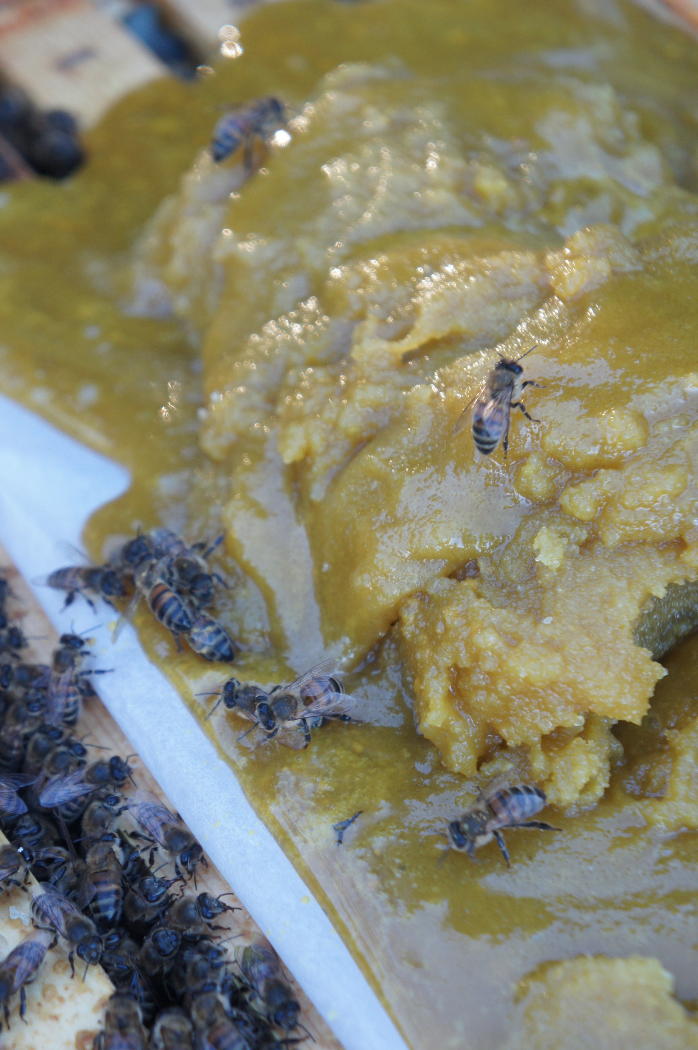 Je n’avais pas pris suffisamment de candi pour les 3 ruches, je vais en re-faire, et reviendrai pour nourrir les 2 autres ruches.