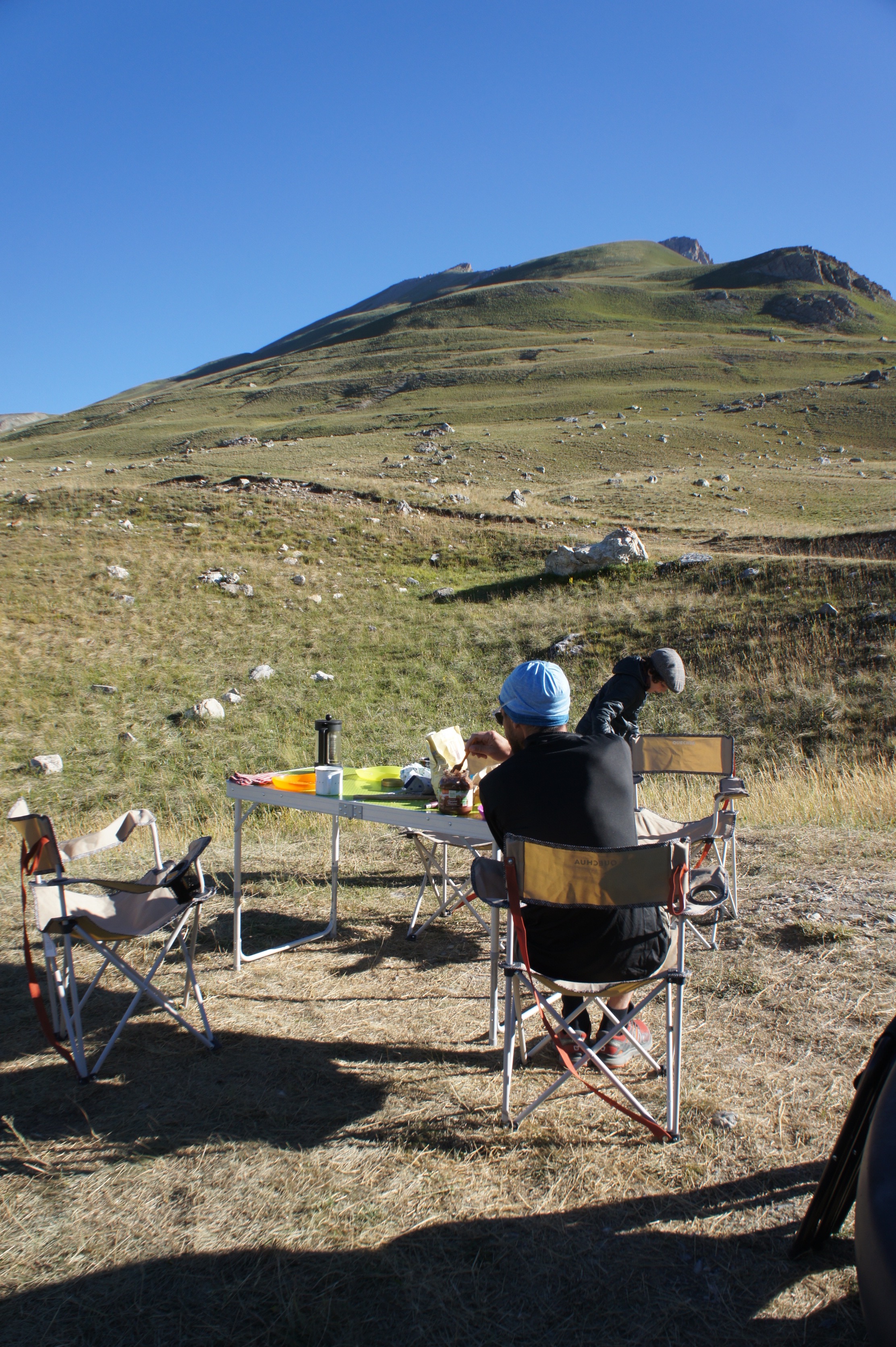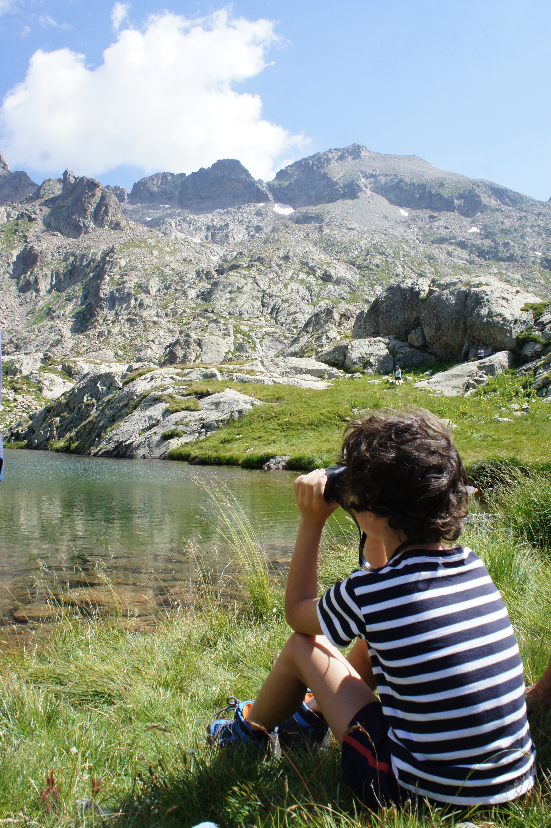 Nous arrivons pour le pique nique au magnifique lac de montagne. Nous y trempons les pieds, et observons des pêcheurs qui sont venus y bivouaquer.