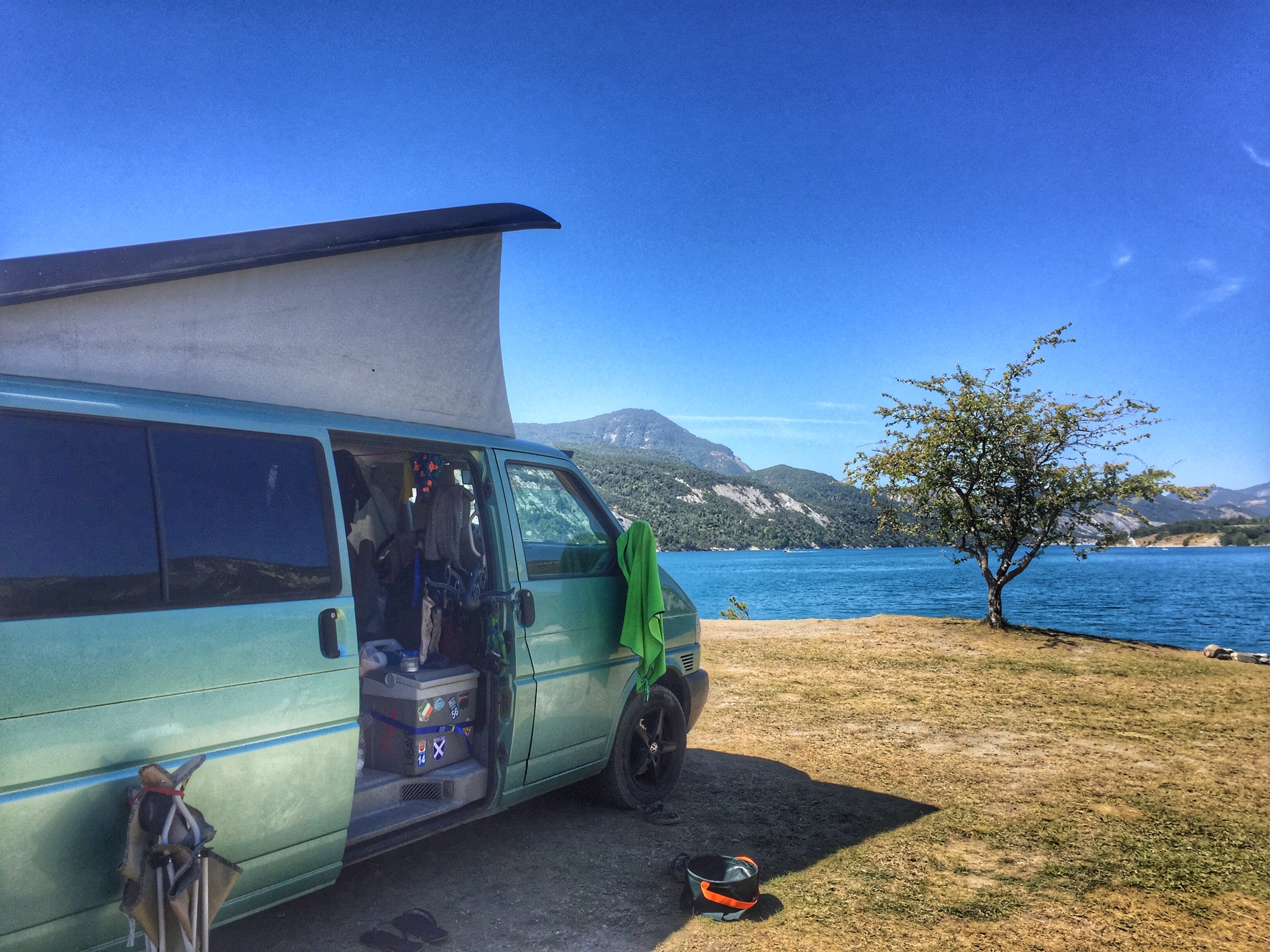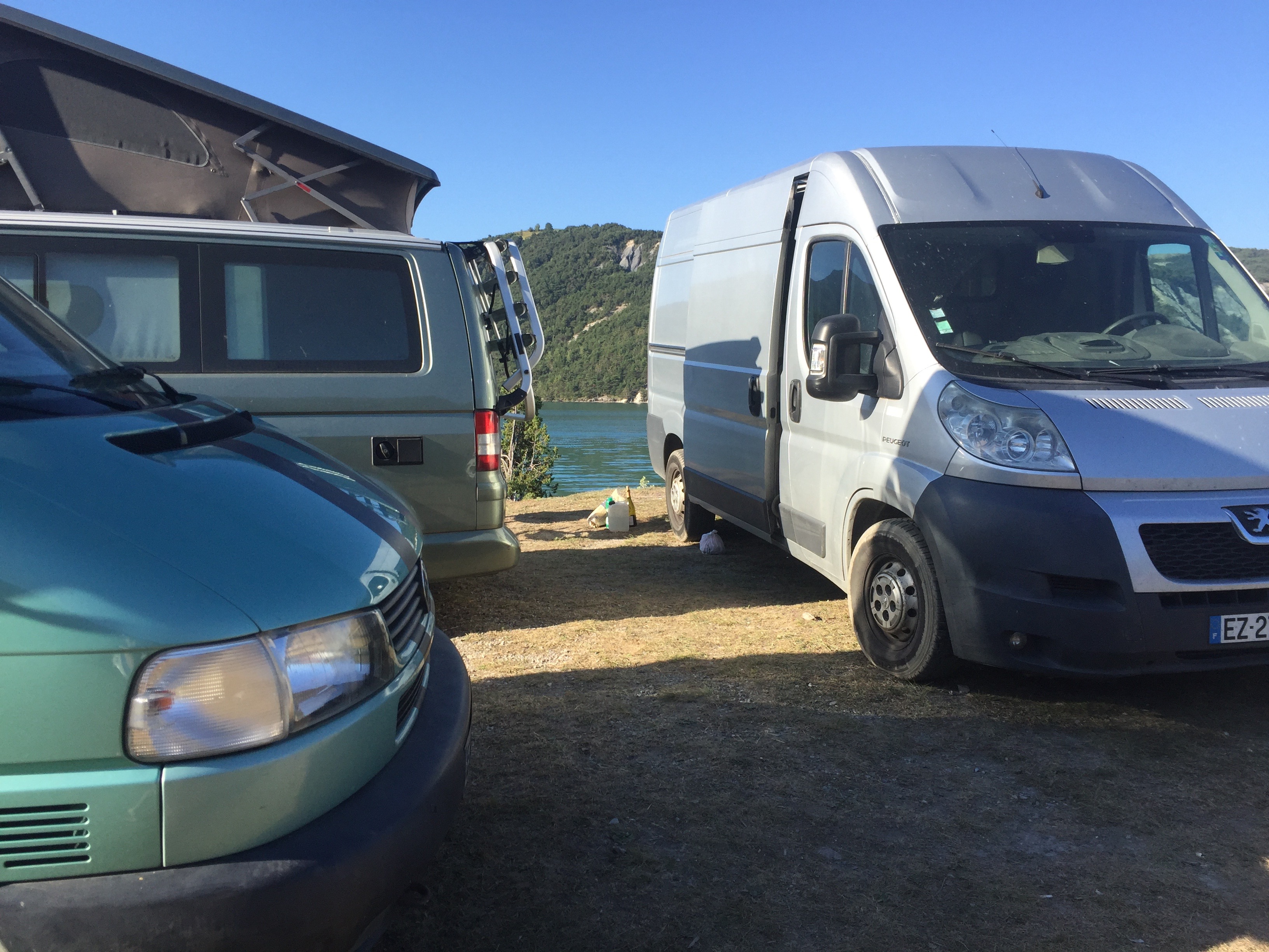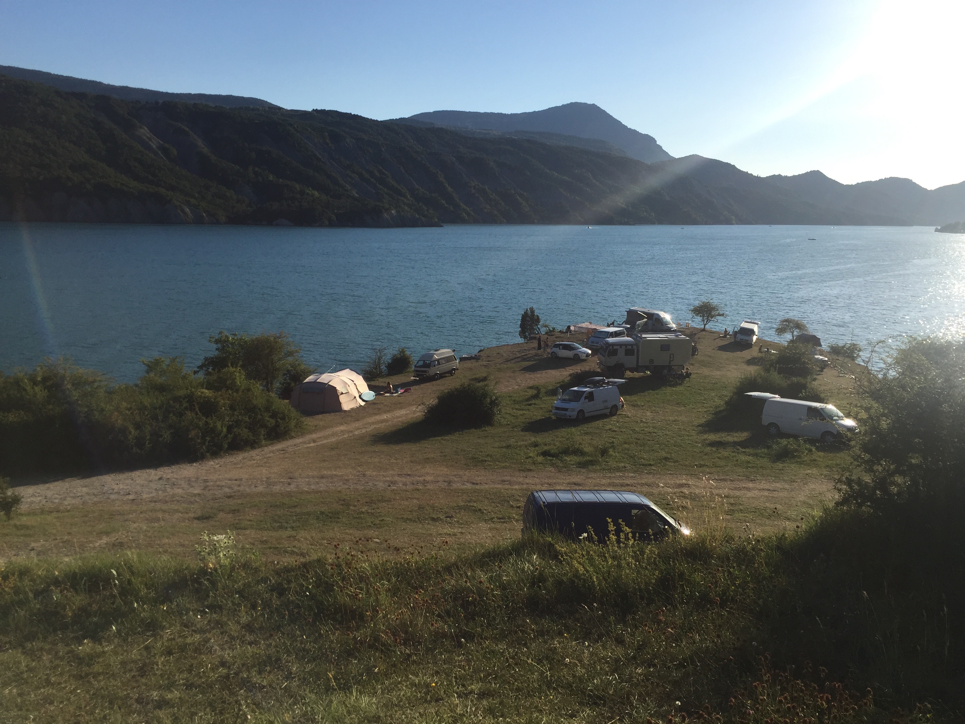 Un pique nique bien mérité, et nous repartons en direction du lac de serre ponçon. Nous faisons un stop pour dormir au départ d’un chemin de randonnée. Doudoune et bonnet sont les bienvenus.