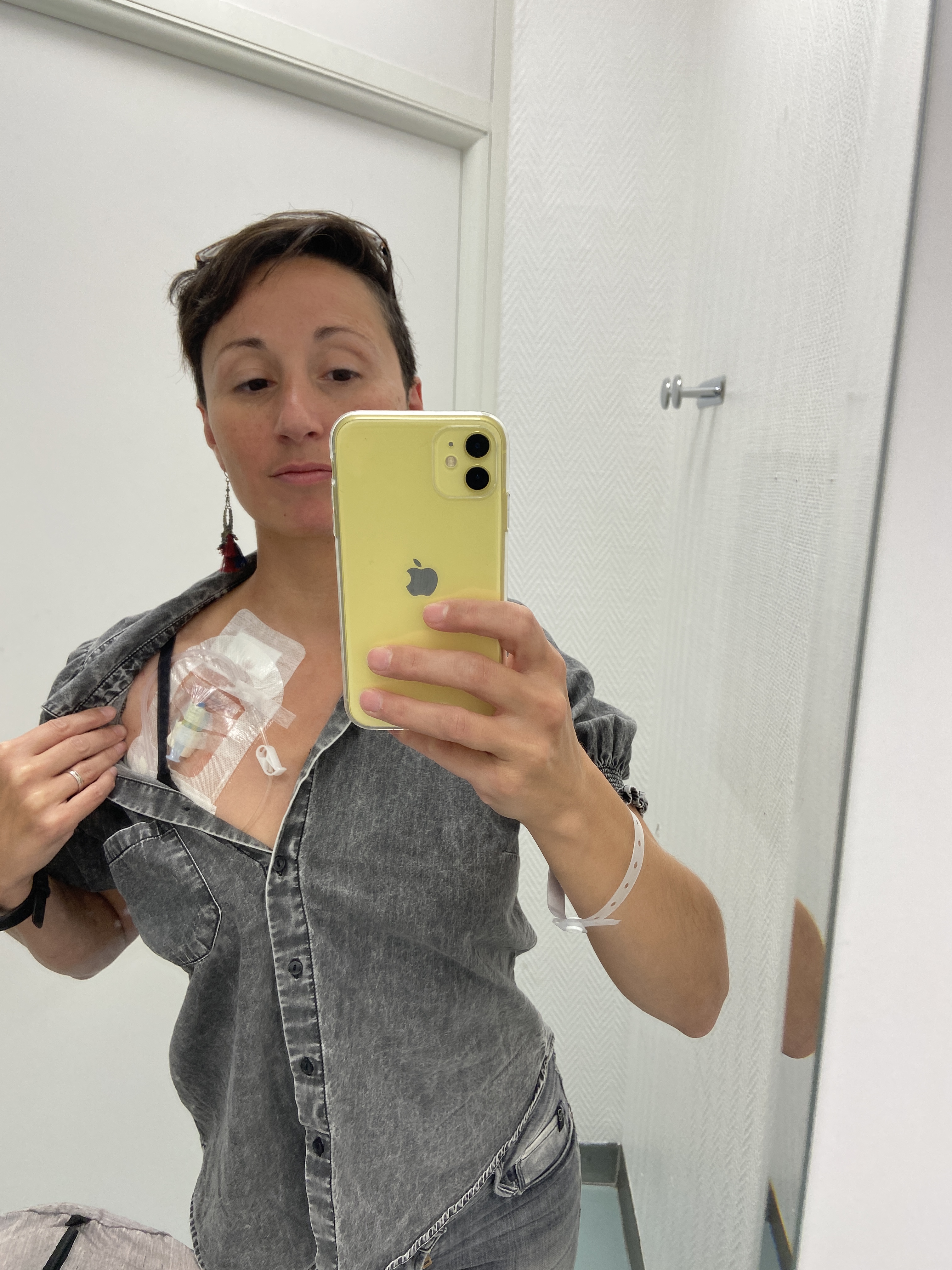 Je suis partie assez sereine jeudi matin, la chauffeur de taxi au top, on a bien papoté, ça m’a bien changé les idées. RDV 10H au bloc pour la pose du cathéter. C’est une infirmière anesthésiste qui a procédé au geste, accompagnée d’une autre infirmière.