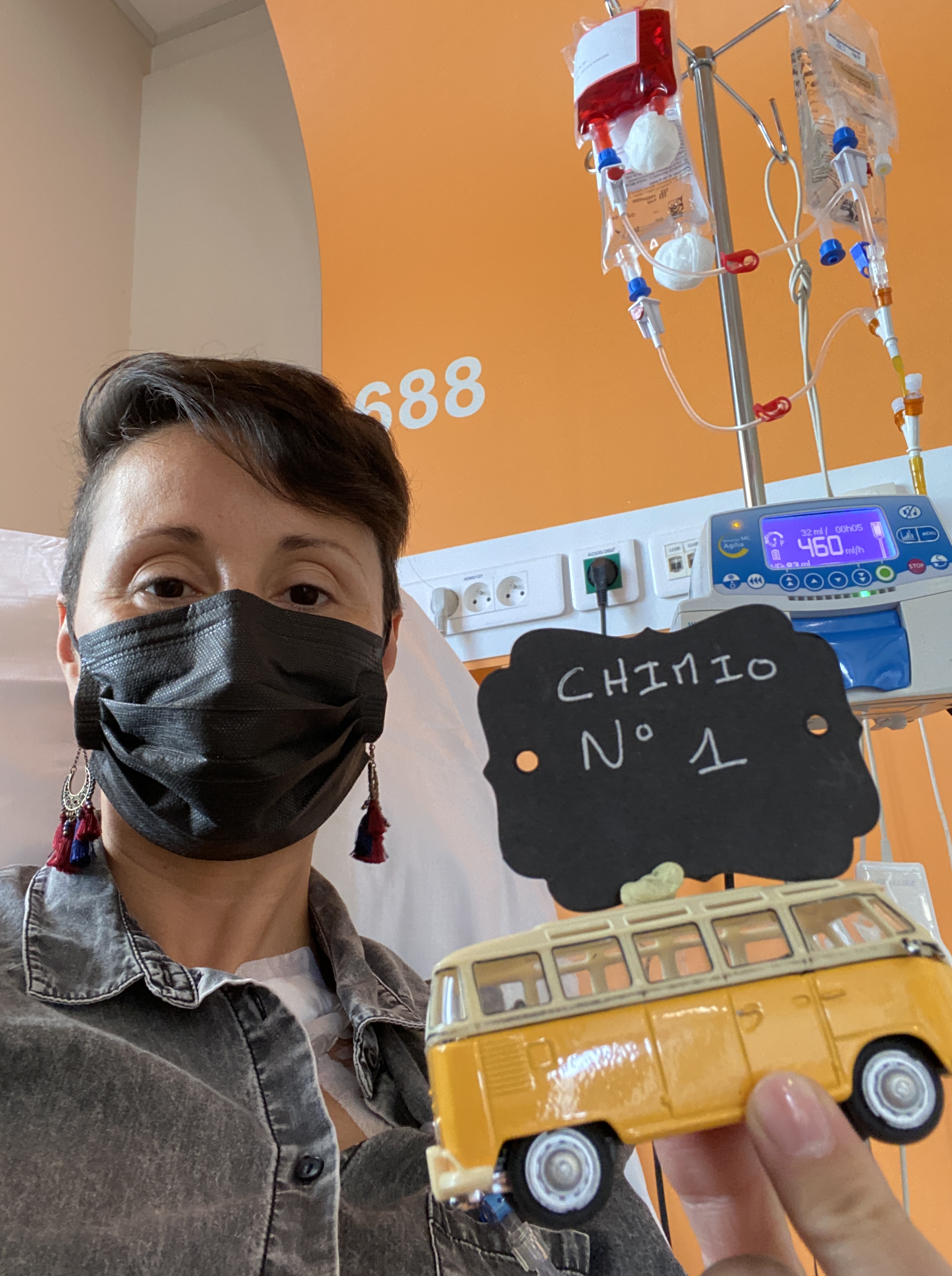 Une fois branchée, c’ést parti pour 1h30, avec des poches à changer, donc en gros toutes les 15 mn fallait sonner l’infirmière. D’un seul coup je sens le bout de mon nez qui fait mal, et une grosse barre dans la tête arriver : c’est le médoc anti-nausées qui fait ça. J’en parle à l’infirmière qui me dit que pour la prochaine chimio je devrais en parler au Doc pour avoir un autre médicament. J’ai aussi un gout de fer dans la bouche qui arrive. J’ai quasi pas utilisé les 150 000 trucs apportés pour la journée, je partirai plus léger la prochaine fois, j’ai pas mal papoté avec d’autres nanas dans la salle d’attente (plus ou moins fun)