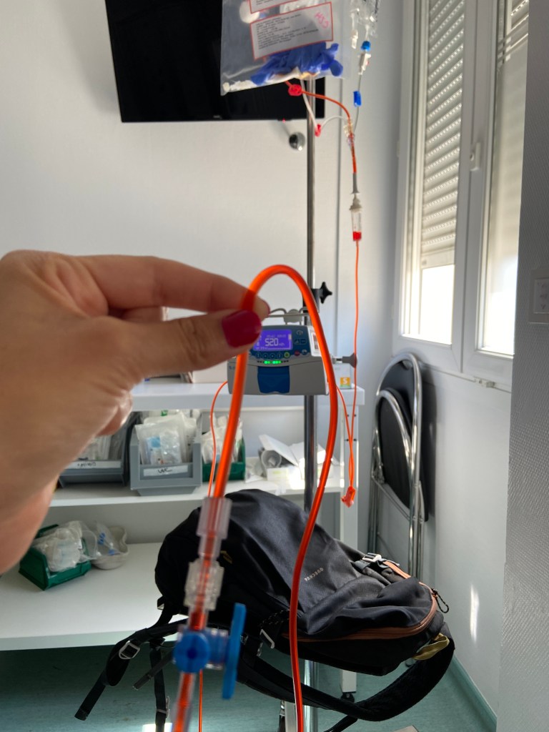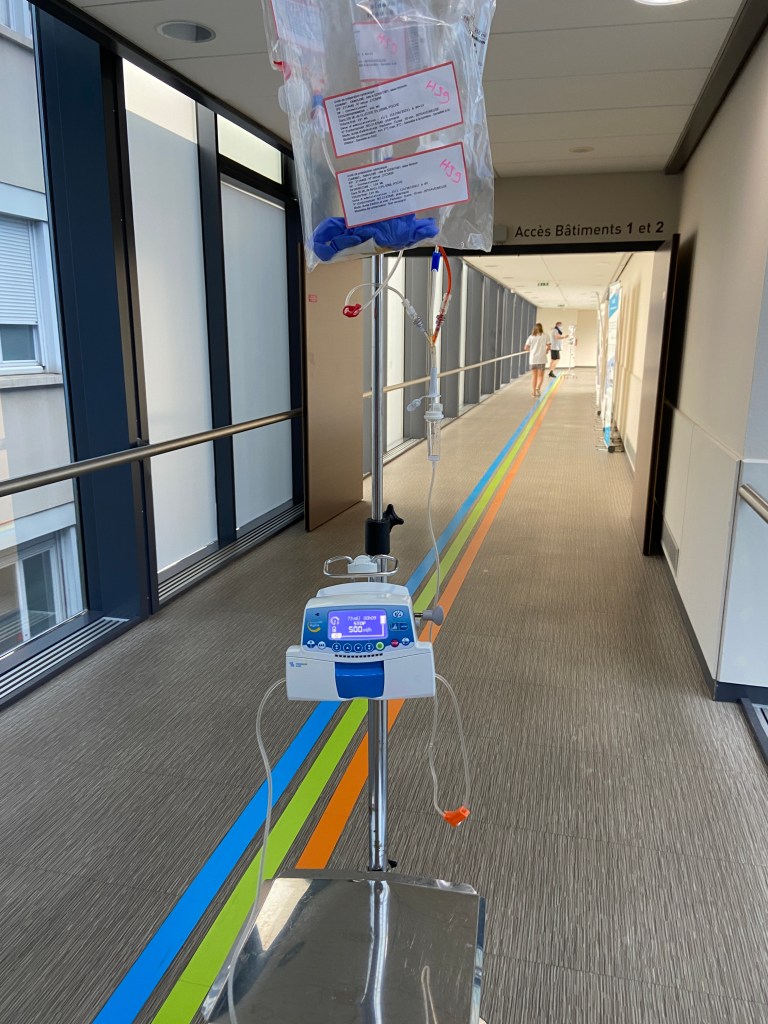 Jeudi, le jour de la chimio je suis passée assez rapidement, y’avait pas grand monde. Et puis aussi j’avais RDV à 16h avec les généticiens, donc il fallait qu’on me piquouze rapidement, ce qui a été le cas. Une fois les produits lancés, je suis allée faire un tour avec ma perf pour mon RDV de 16h.