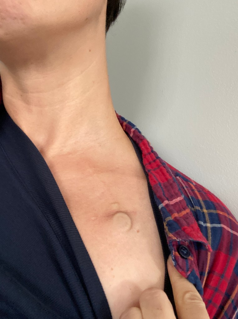Pour clore l’année en beauté, j’ai aussi vécu une étape importante : le 9 décembre dernier on m’a enlevé mon cathéter de chimio. Adios le boitier qui me rentrait dans ma veine du cou et du cœur.
