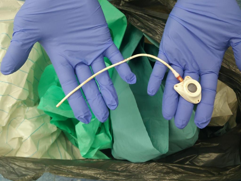 Un mot avait été glissé dans mon dossier concernant mon appréhension. Une fois habillée pour le bloc, et dans la salle d’attente, une infirmière est venue déposer sur mes yeux un casque de réalité virtuelle…. et j’ai pu le garder pendant l’intervention. Pendant toute la durée du geste opératoire, je me suis promenée en forêt au fil des saisons. Et au moment où l’intervention se terminait j’étais virtuellement dans un chalet, un thé à la main, près d’un feu de cheminée à regarder la neige tomber. Une expérience hyper relaxante….J’ai senti une petite gêne au moment où ils m’ont enlevés la bête… mais rien de plus. Quand ça s’est terminé j’ai pu voir la bestiole qui m’a accompagné durant 17 mois…. beaucoup plus long que ce que j’imaginais….(sur la photo en dessous ce n’est pas le mien mais ça y ressemble)