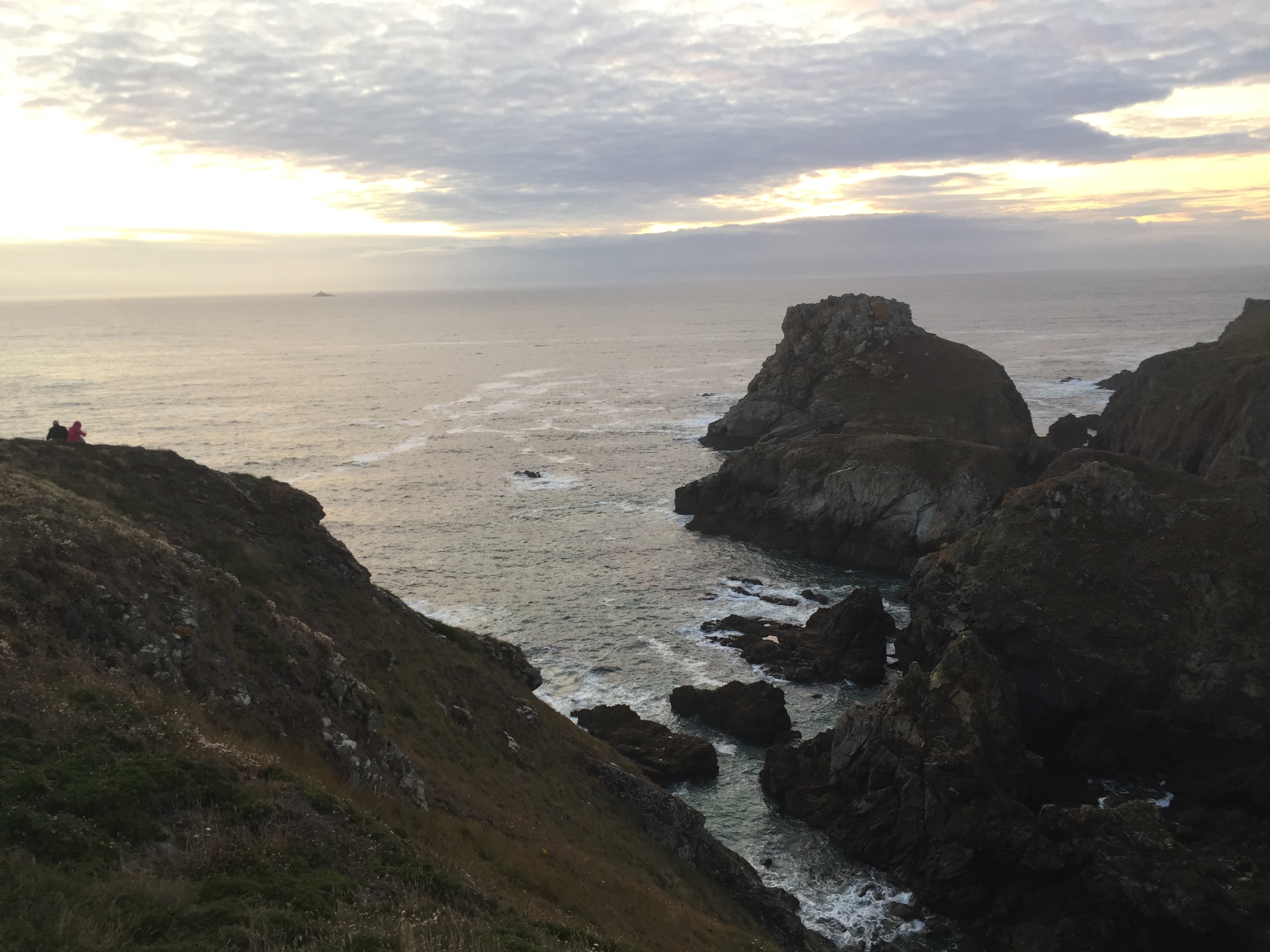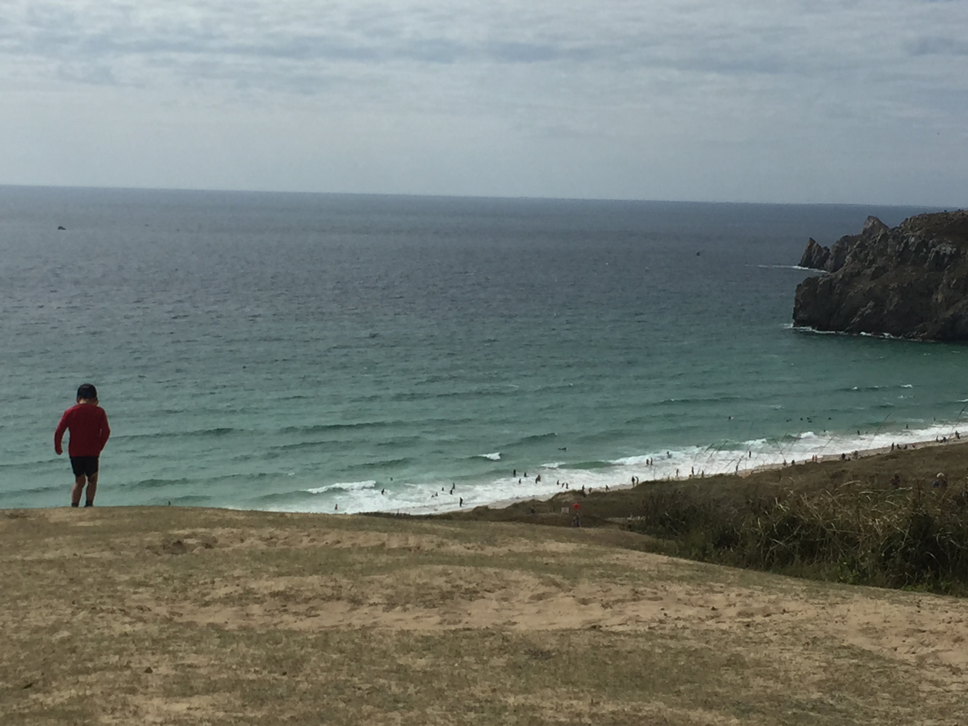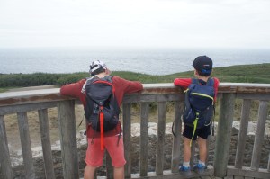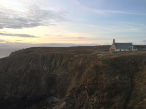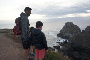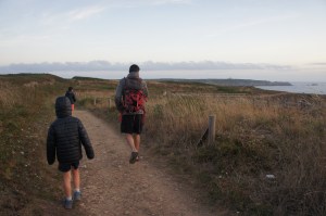 Les gars font connaissance avec d’autres enfants sur le parking. Puis après manger, nous allons admirer la vue, qui est juste superbe, et qui nous rappelle l’Irlande. De grandes falaises, le soleil qui se couche. Nous sommes bien contents d’avoir les doudounes pour la promenade, car une fois le soleil couché il fait vite frais. Nous sommes quasi les seuls à se promener à cette heure-ci. Ca valait le coup d’oeil.