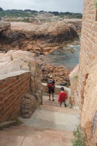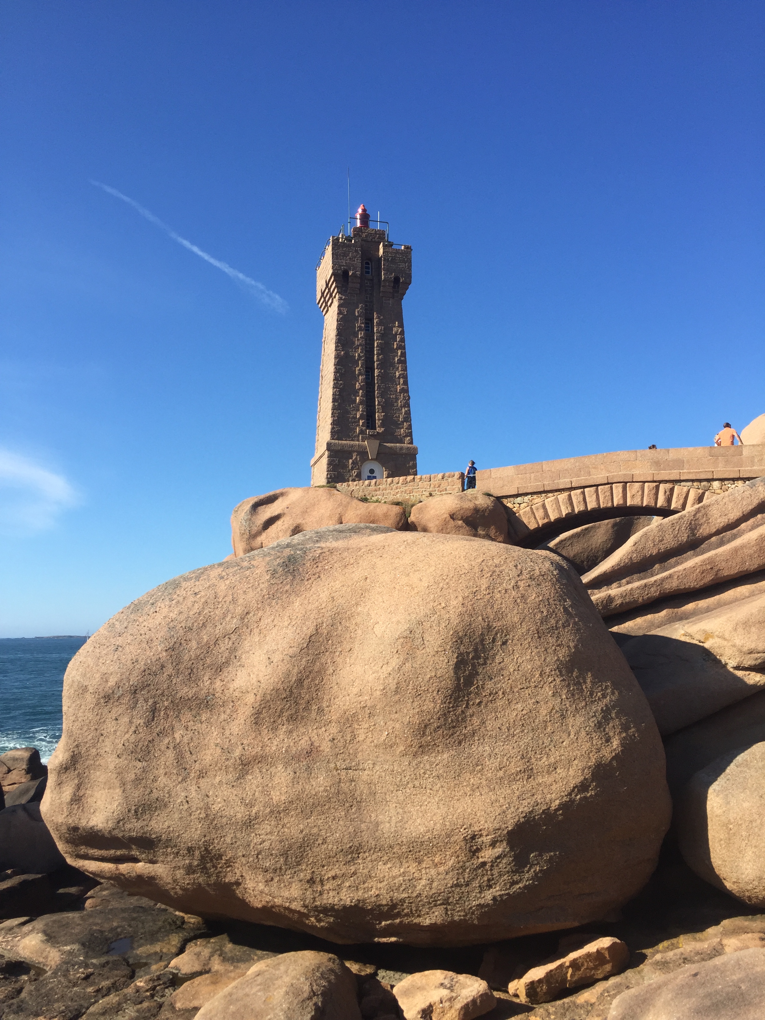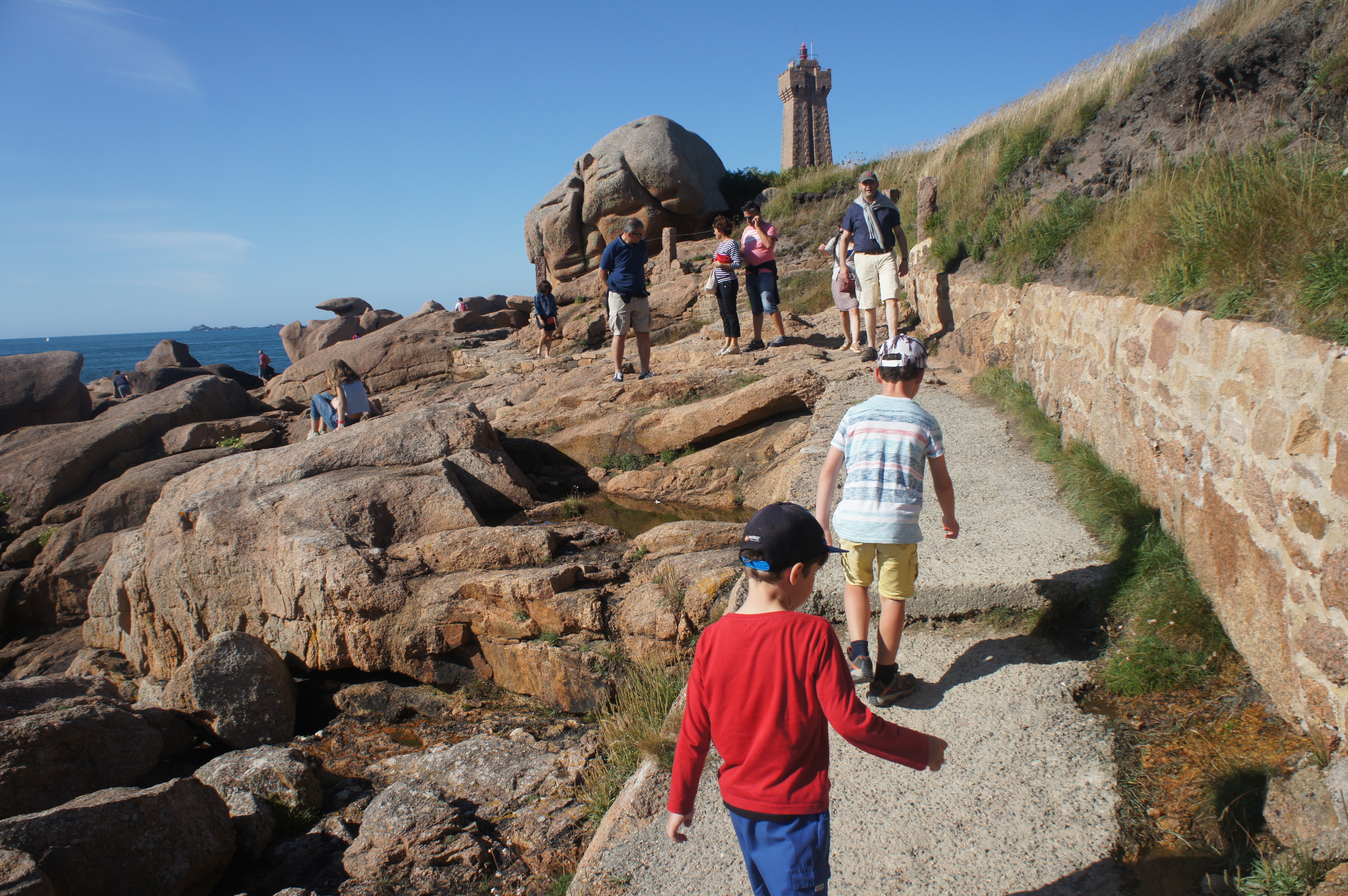 Nous profitons de la douche (froide) pour nous savonner un petit coup. Petite crêpe, puis nous reprenons la route vers la côte de granit rose. Nous arrivons en fin d’apres-midi, et filons directement vers le sentier des douaniers pour voir le phare de Ploumana’ch (situé à Peros-Guirec). Nous étions venus ici il y a 7 ans avec bb1 tout petit. C’est toujours aussi beau…. et rose :p