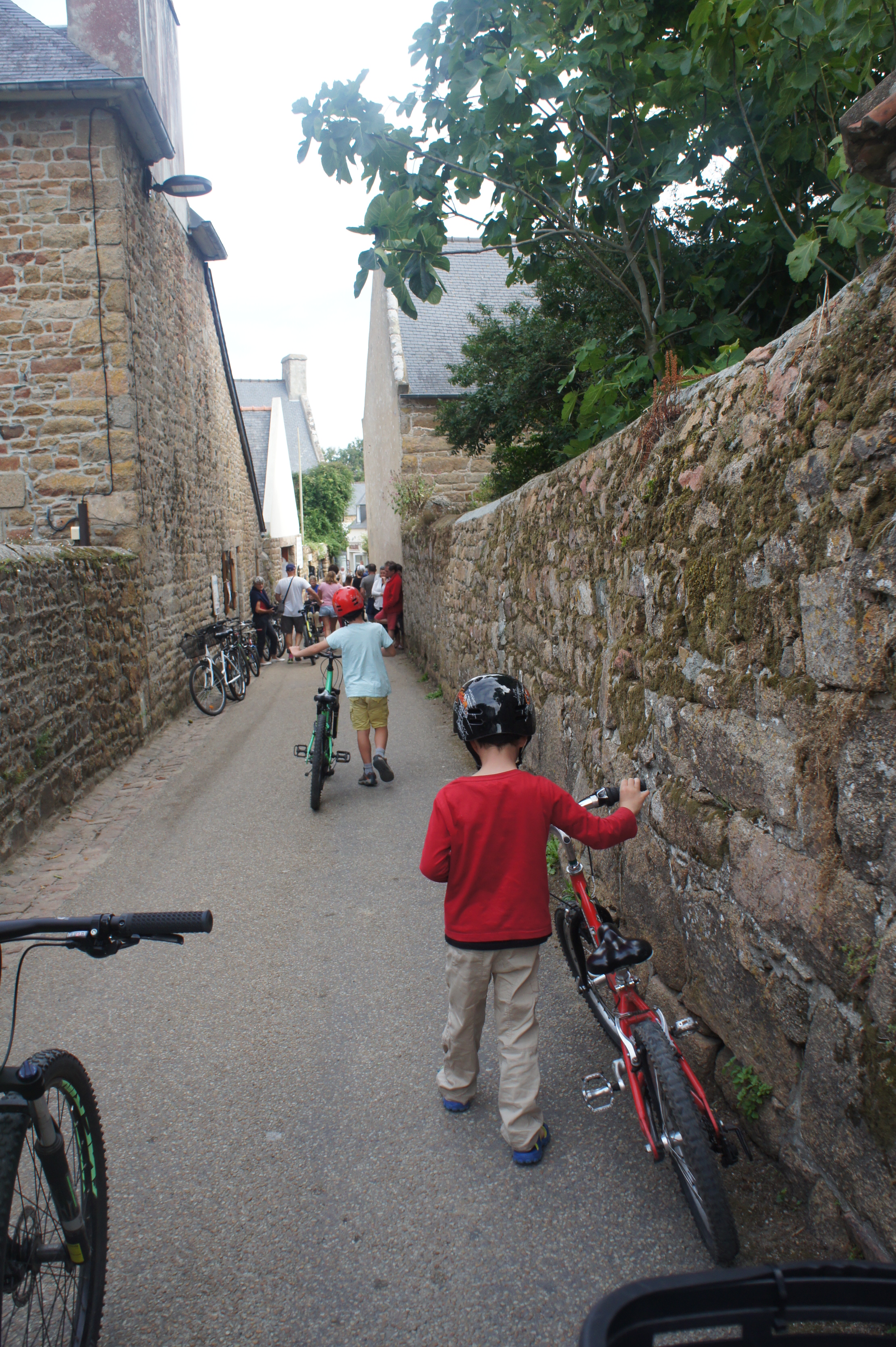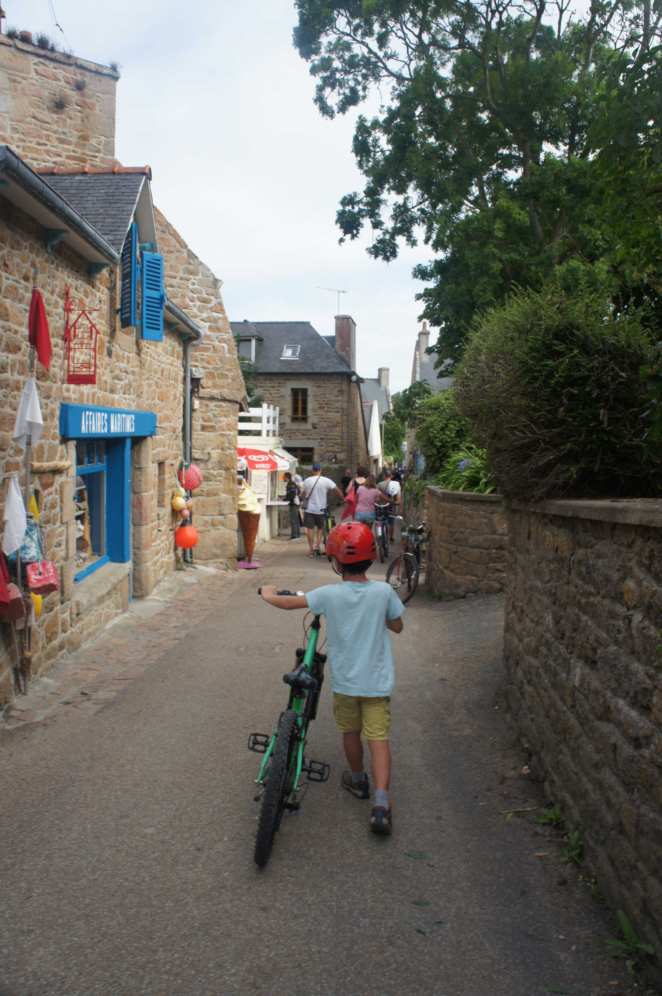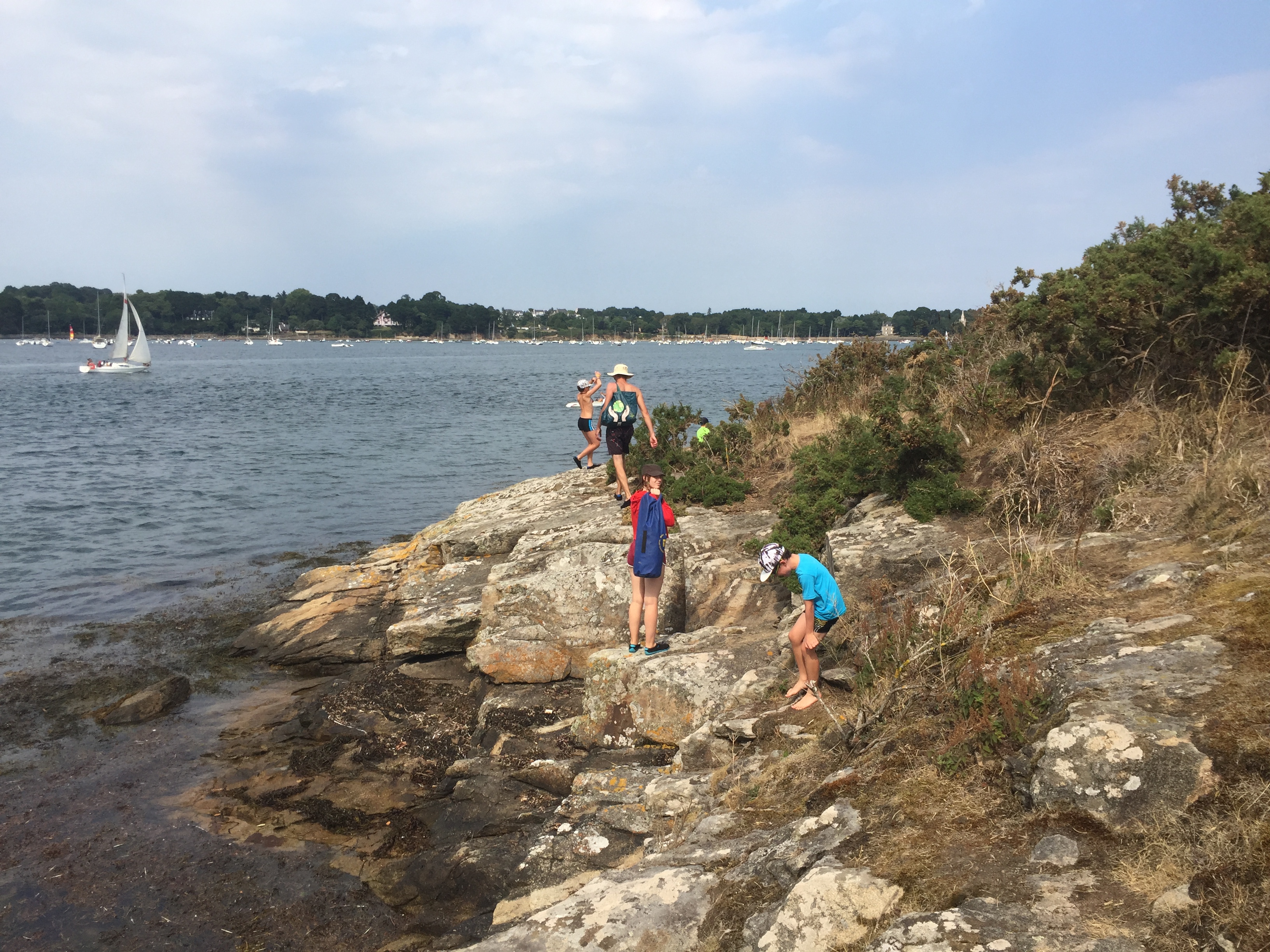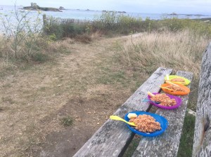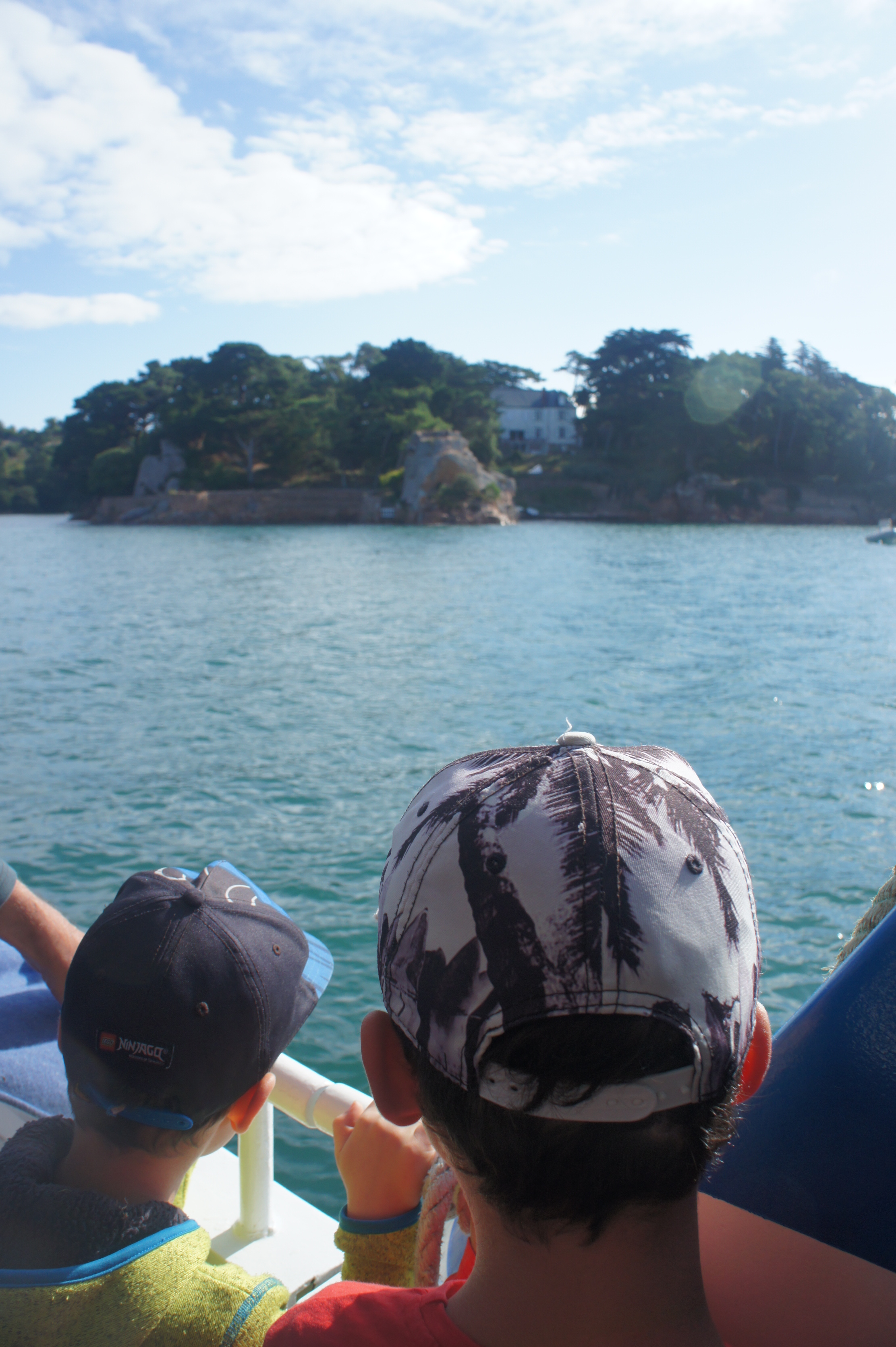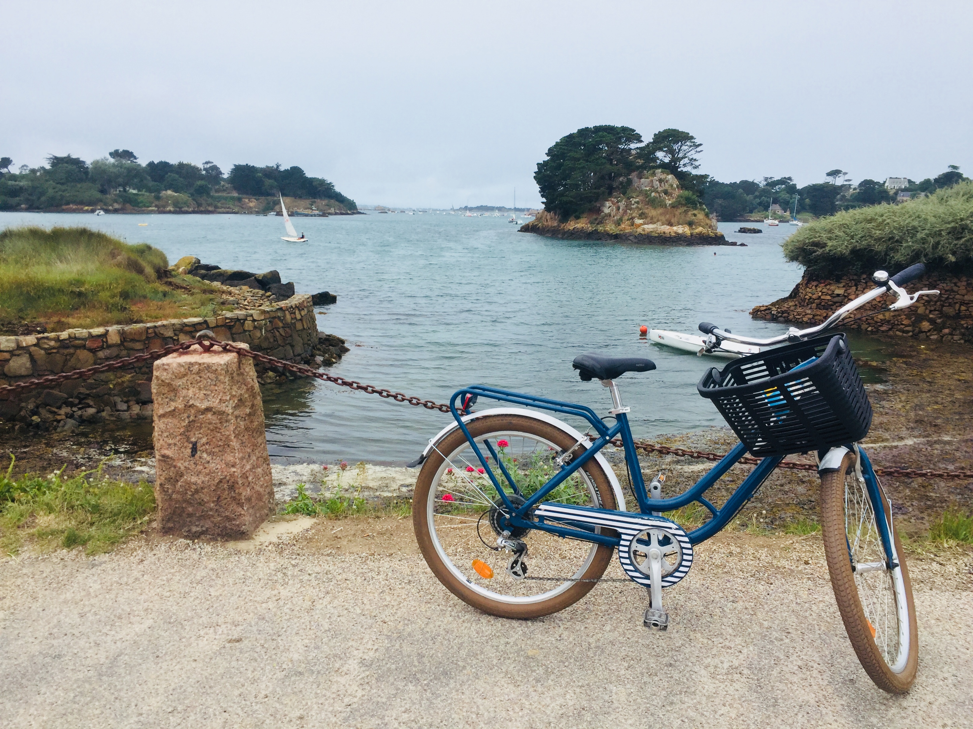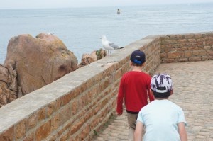 Départ matinal (8h30) vers l’embarcadère de l’île de brehat. Il y a beaucoup de monde déjà! Nous y passons une superbe journée. A notre arrivée nous louons des vélos pour faire le tour de l’île, ce qui est beaucoup plus simple et rapide avec les enfants. Nous n’aurions pas pu faire tout cela sinon! Nous avons fait une dizaine de kilomètres à barouder sur l’île, en prenant notre temps. Petit café en terrasse, phare, sentier….L’île est magnifique avec des rochers parfois roses, parfois noirs.