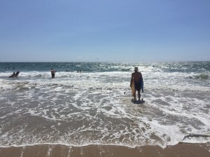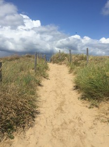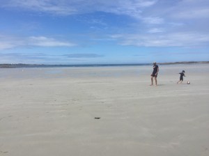 La nuit a été calme en bord de mer. Nous avions réservé du char à voile, mais faute de vent, la session est annulée. Il fait beau, nous en profitons pour passer un bon moment en bord de plage. L’eau est très loin, tout là bas au fond! et oui il y a les grandes marées ici.